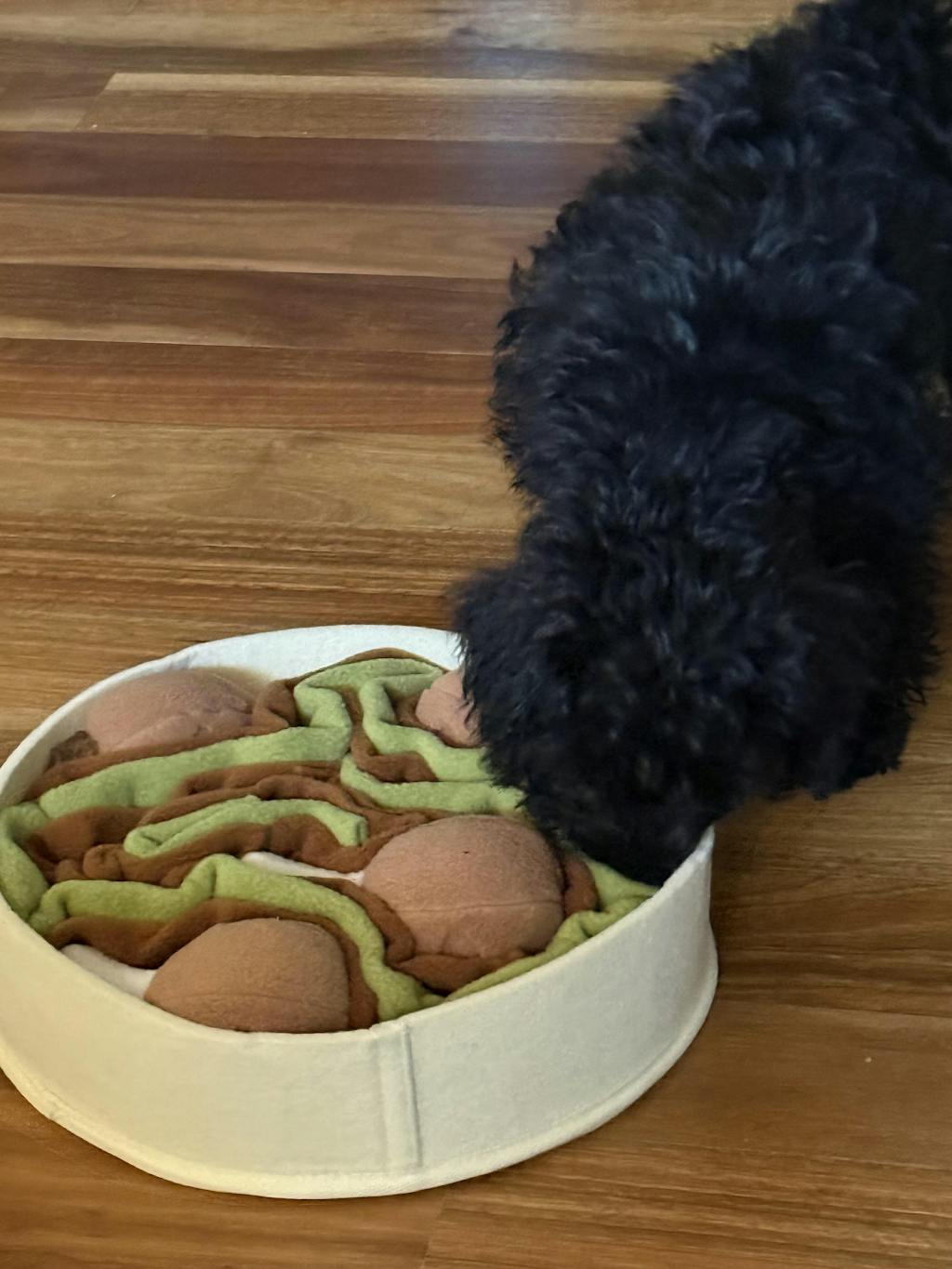This is a snuffle enrichment toy designed for sniffing and foraging, not chewing. Some pups may dig, scratch or play enthusiastically, which can cause softer materials to wear or fluff over time.